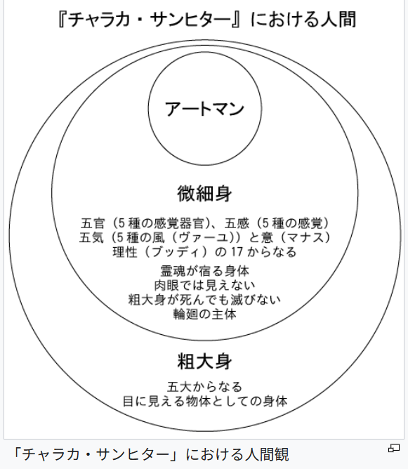 また 生命(アーユス)は「身体(シャリーラ)・感覚機能(インドリヤ、五感)・精神(サットヴァ)、我(アートマン、自己、魂、真我)」の結合したもの